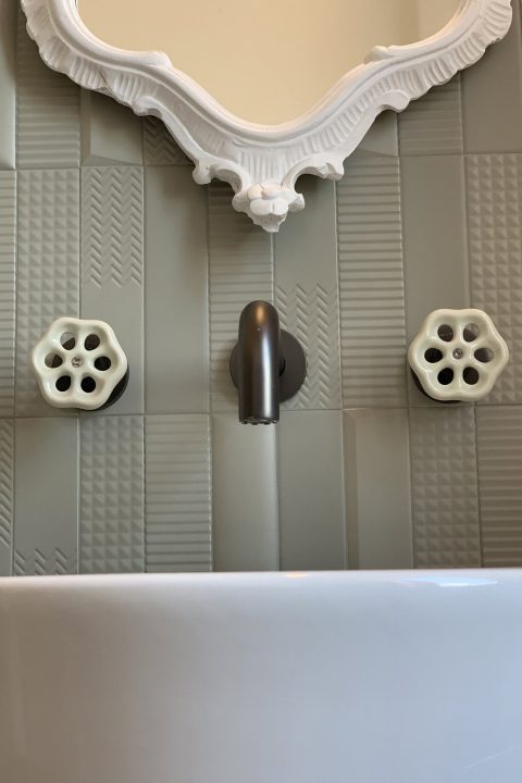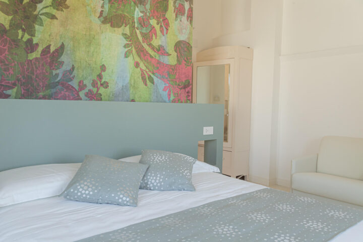 And it was the intense green of the Carboncella oil that inspired this room. A green that is found in the headboard and in the floral pattern of the wallpaper that recalls harmony but at the same time spiciness with notes of bright contrasting color. The same green can still be seen in the gentle expanses of the hills, rich in olive groves and vineyards, which can be seen looking out from the bright windows towards the sea, that lets itself be glimpsed just enough to calm the soul and heart.