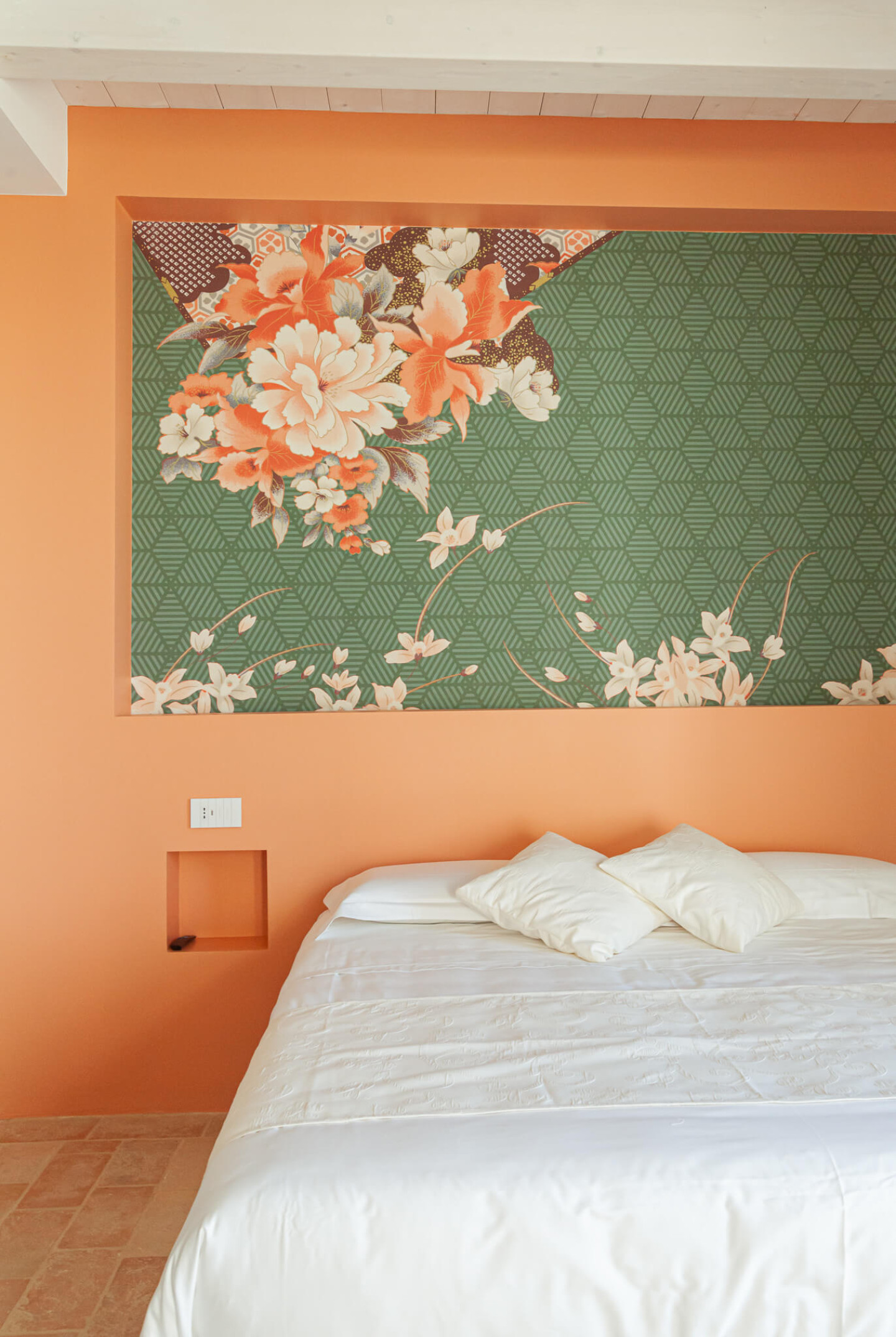 The choice of materials, such as wood for the floors and terracotta resulting from the reuse of materials from the demolition of the old farmhouse for the floors, starts from the desire to convey warmth and hospitality; the white of the walls, in its purity, offers lightness and tranquility; the floral paper behind the bed recalls the harmony and sweetness of almond blossoms, evoked by the scents released by Raggia oil.