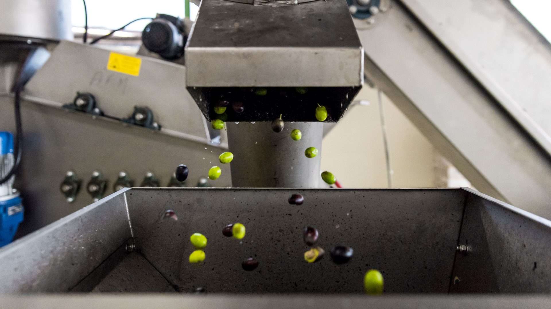 With the discontinuous system, the olive is placed in a tank in which three stone mills rotate. The olive is crushed and reduced to a pulp by the mills that run for several minutes. The olive, through pressure and rubbing (pulp and bone) becomes a “paste”. This process has a series of drawbacks: mechanical crushing heats the pasta, contact with oxygen oxidizes it and being the tank open, the scents are dispersed in the air.