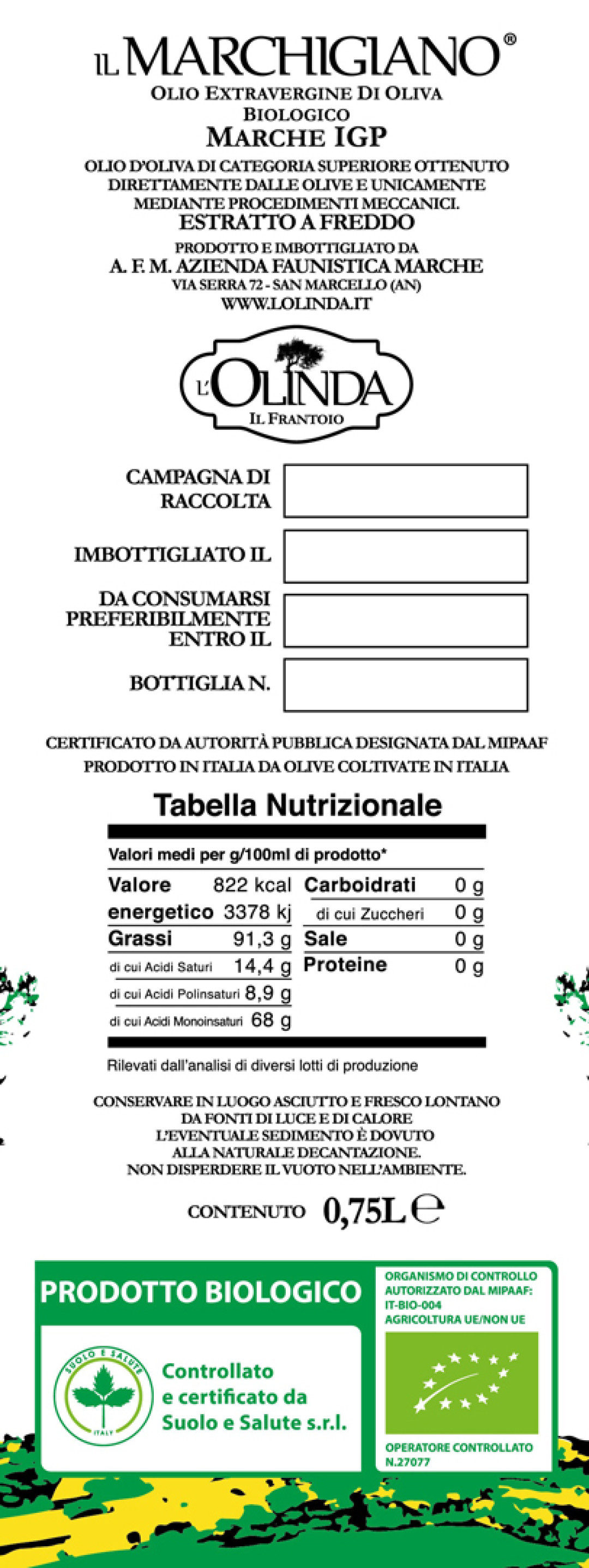 The MARCHIGIANO Marche IGP Organic is our IGP (Protected Geographical Indication) oil obtained exclusively from the fruit of the olive tree of native cultivars (Raggia, Mignola, Rosciola Colli Esini, Piantone di Mogliano, Coroncina, Carboncella, Ascolana Tenera, Orbetana, Piantone di Falerone ), absolutely milled within 3 hours of harvesting. The Marchigiano Marche IGP has olfactory and gustatory characteristics and values (acidity, peroxides, polyphenols, etc …) indicated by a rigorous disciplinary, it is a very aromatic oil with balanced taste sensations.