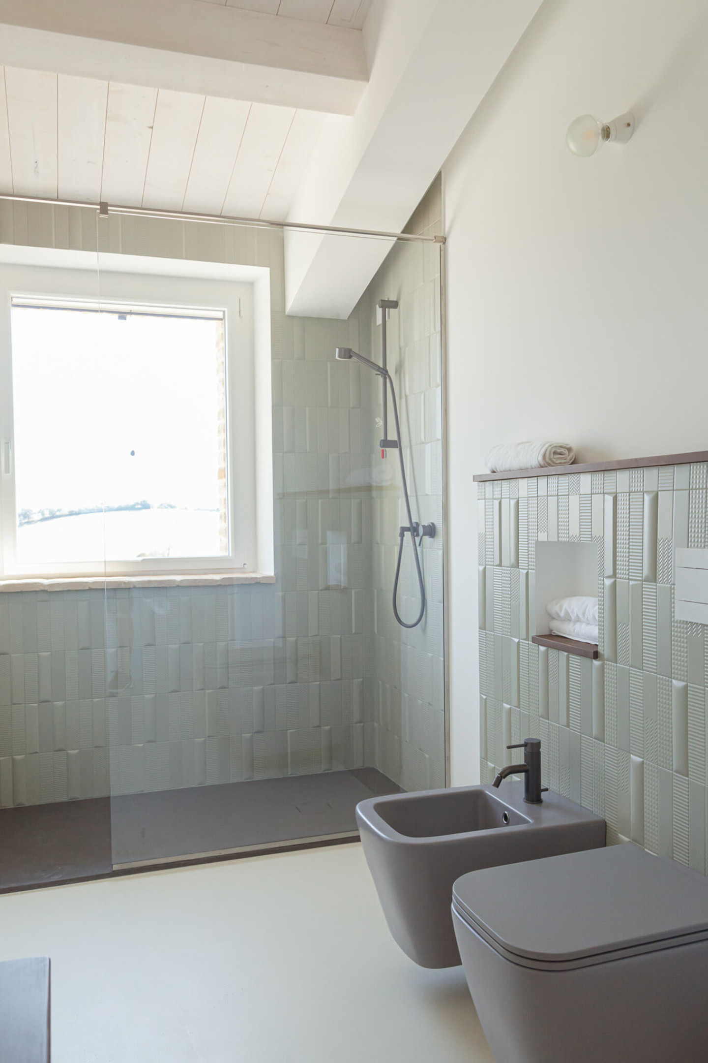 Un bagno spazioso, con una suggestiva doccia che si affaccia sull’uliveto aziendale tramite una finestra che sembra essere più un dipinto che un affaccio all’esterno, va a completare l’affascinante particolarità della “Mignola”.