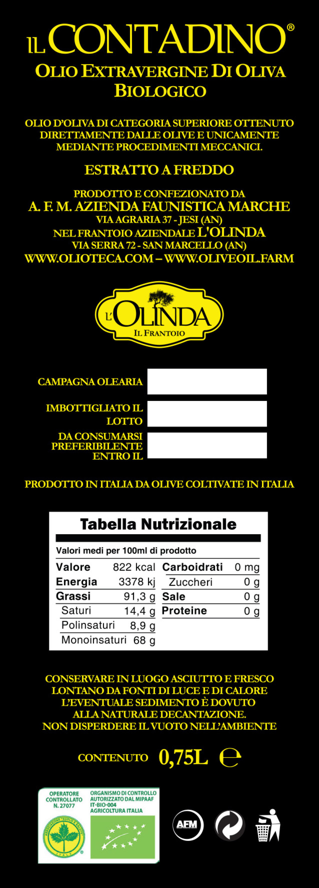Va conservato in un luogo asciutto a temperatura non superiore a 18/20 gradi. Una volta aperta la confezione (lattina o bag in box) è opportuno travasare l’olio in contenitori più piccoli in modo che sia il meno possibile a contatto con l’ossigeno. Va protetto dalla luce (non usare bottiglie trasparenti), dall’aria e dal calore. L’olio assorbe gli odori quindi meglio non usare le oliere e chiudere sempre la bottiglia o la lattina. È importante sapere che la scadenza (18 mesi dall’imbottigliamento) è solo indicativa. Dopo tale data l’olio non diventa nocivo e quindi si può utilizzare senza alcun rischio per la salute Perde però l’intensità e la fragranza di profumi e sapori.